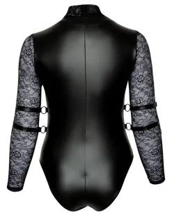 Detailverliebter Body von im anschmiegsamen Wetlook mit langen Spitzenärmeln und Stehkragen mit Frontring. Vorne in Harness-Optik mit verstellbaren Riemen, hinten sorgfältig eingearbeiteter langer Reißverschluss. Für spontane Leidenschaften lassen sich die beiden Reißverschlüsse über den Brüsten und der Reißverschluss im Schritt schnell öffnen. Für fesselnde Lustmomente sorgen die 4 Armfesseln, die mit ihren Karabinerketten an den seitlichen Ringen der Taillenriemen befestigt werden können. Die Fesseln sind mit ihren Klettverschlüssen schnell angelegt und passend verstellbar. Die 2 vorderen verstellbaren Strapse sind vom Slip-Teil abnehmbar.